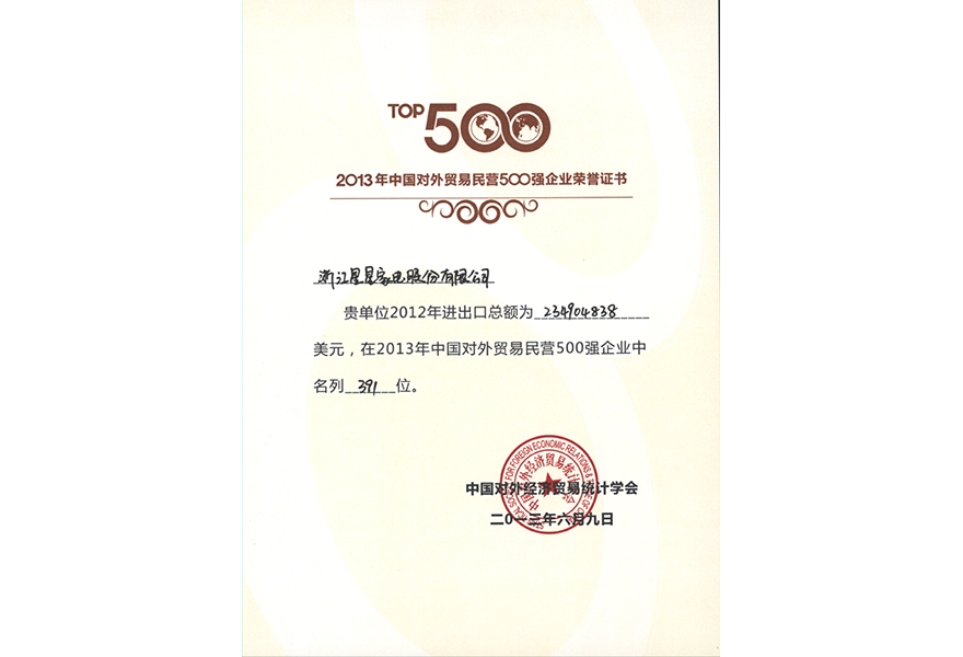 2013年中國對外貿(mào)易民營500強(qiáng)企業(yè)榮譽(yù)證書