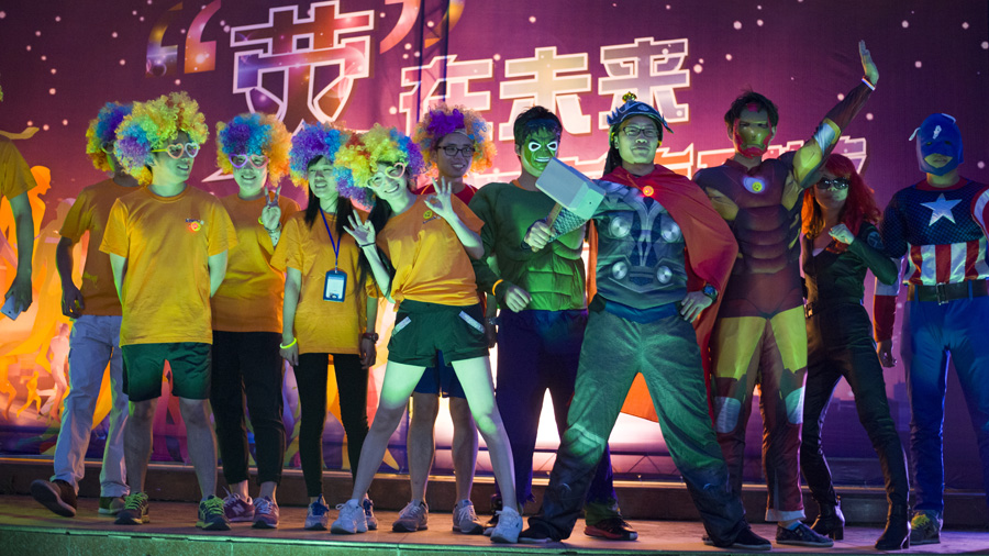在一曲《葫蘆娃》的音樂聲響起后,只見集團總部代表隊在超人與蛇精的帶領下,領著七個cos得惟妙惟肖的葫蘆娃,喊著“兄弟一家,活力迸發”的口號高調上場;尾隨其后的是法海許仙白娘子與小青帶領的星星家電代表隊,他們的口號是“千年等一回,法海也懂愛”;再是一群酷到流鼻血的、由鋼鐵俠、美國隊長、雷神、無敵浩克等組合而成的復仇者聯盟的閃亮入場,他們是喊著“讓我們一起拯救地光球”口號的水晶光電代表隊;最后上場的是星星瑞金科技代表隊,他們的西游取經裝扮寓意星星科技公司一路降妖伏魔,歷經九九八十一難,終將修成正果,他們的口號是“不畏艱險,一路向前”!